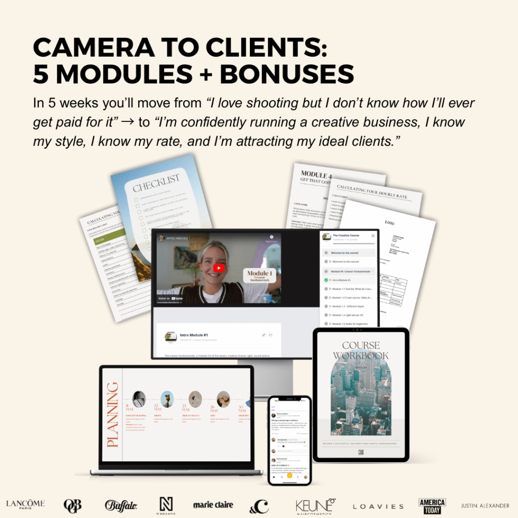 In 2019 things took a turn. I had learned so much that I was ready to show my work and put my business strategy to the test. I started working with high-end influencers, traveled to 20+ countries in 1 year to work with big brands and had my first 5-figure months. Curious about how you can find this same level of freedom and creativity too? I’ve got you. When I was doing that shit-study, not knowing where or how to start as a photo-/videographer, I promised myself that: If I could figure this out one day, I was going to teach other creatives exactly how to get there. So, here we are! Up until now I’ve already been able to help over a 100 visual creatives to pave the way into becoming a profitable and successful photo-/videographer and I can’t wait to share all of my ways with you too!