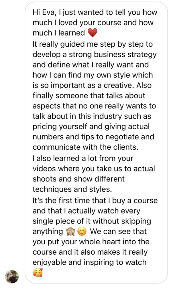 I just wanted to tell you how much I loved your course and how much I’ve learned. It really guided me step by step to develop a strong business strategy and define what I really want and how I can find my own style which is so important as a creative. Also finally someone that talks about aspects that no one really wants to talk about in this industry such as pricing yourself and giving actual numbers and tips to negotiate and communicate with clients. I also learned a lot from your videos where you take us to actual shoots and show different techniques and styles. It’s the first time that I bought a course and that I actually watched every single piece of it without skipping anything! You can see that you put your whole heart into the course and it also makes it really enjoyable and inspiring to watch!