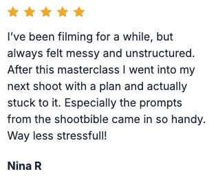 I just finished your course and I have never finished a course so fast! I really learnt a lot about what I want with my career from your lessons on goals and manifesting which you are the first course that I’ve ever seen to do this and I am shook but so grateful. I also love how you actually put down figures for pricing video’s/photos because no one ever wants to talk about money but it is so helpful! I can’t wait for you to share this course with more people and to see everyone’s work in our online community!