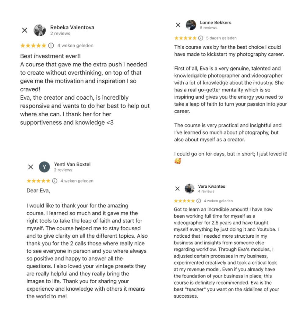What a course! This is the first time I have invested in a professional course, I must say I was a bit hesitant since of course it’s a bigger investment. It was the best decision ever! It gave me that massive push to come out of my shell and experiment, approach brands and people and just create without overthinking. One of my favourite parts of this course is the platform where I can connect with other creatives and ask for help or feedback. Also Eva is incredibly responsive and wants to do her best to help out where she can. Another thing I loved is the workbooks (PDFs) she has created for some of the sections in the course. It’s like a hand that takes yours and helps you take that step to come out of your shell and find your niche. I am definitely a lot more comfortable within my craft and not worried at all to approach people or telling everyone that I AM A PROFESSIONAL PHOTOGRAPHER, no matter how much experience or knowledge I have.